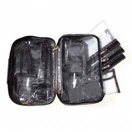 The ultimate 8-Piece Toiletry and Cosmetic Organizer with five removable pouches plus separate cases for toothbrush and razor. Includes concealed hanging hook